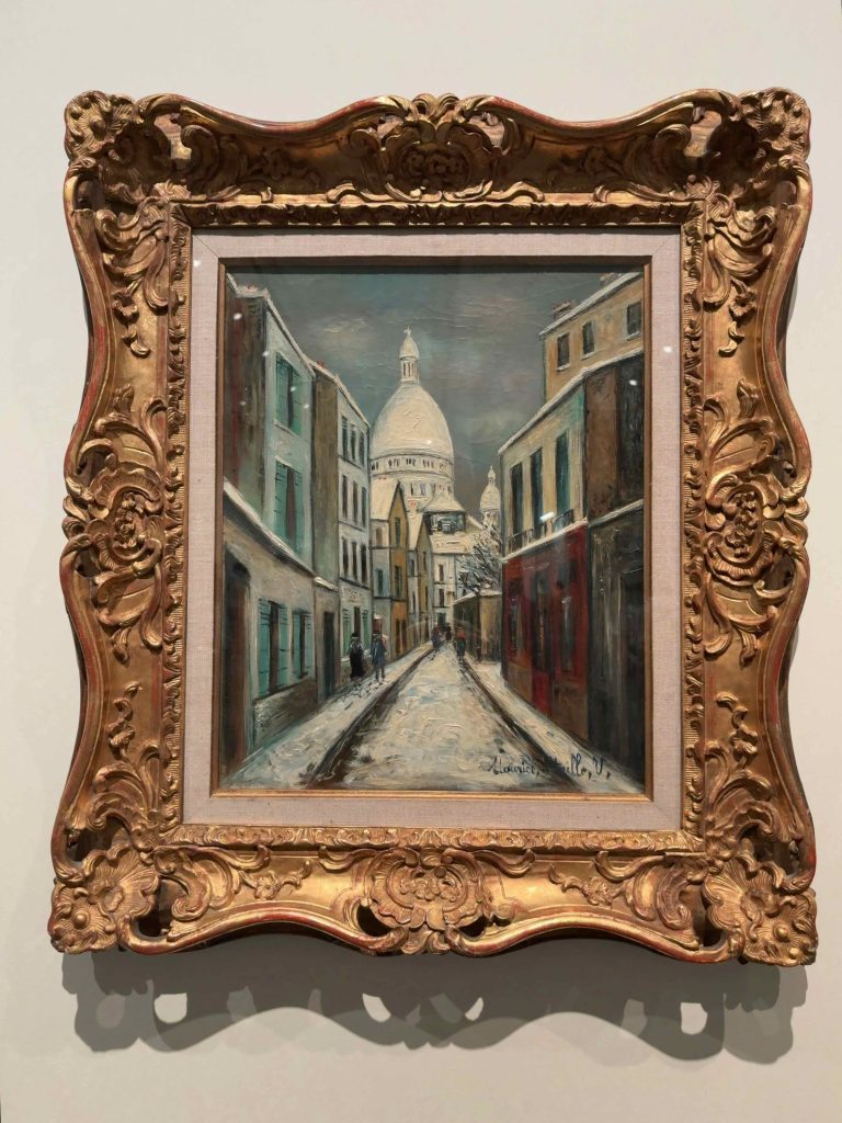 3章のうちメインとなるのは、ユトリロの全盛期といえる「白の時代」で、他の章の倍くらいの作品が展示されています。とはいえ、ユトリロ作品を象徴する建物の白壁は各章を通じて現れてくるので、章毎の明確な区切りは見つけづらいと思いました。白壁の町並みの中を、一人散策しているような感覚を覚える作品が多かったです。下記の作例は、「雪のサン=リュスティック通り、モンマルト」(1933年頃)です。