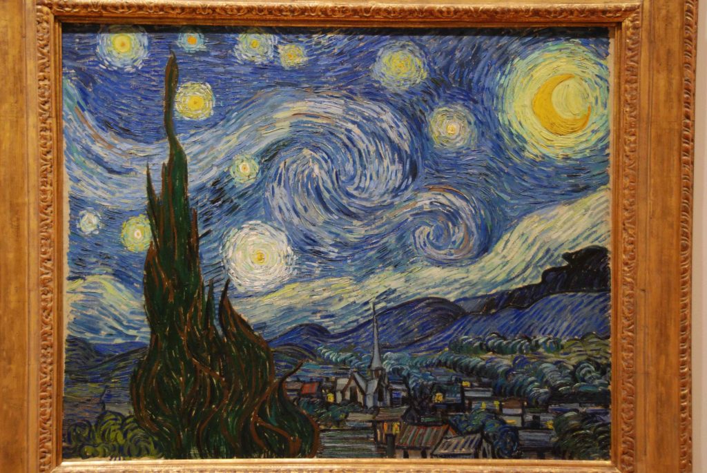 「画家としての自画像」でゴッホの上着の模様は、色鮮やかな青地に橙色の線が流星のように彩られており、「星月夜」(1889年)の夜空の大渦巻を連想しました(下記の写真は、筆者が2009年にニューヨーク近代美術館で撮影したもの)。